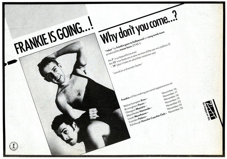 artist: Frankie Goes To Hollywood title: Relax format: Sounds 1/2 pg advert design: XLZTT photography: Anton Corbijn cat. no: ZTAS1 date: 19/11/83 art of notes: The photo was taken by Anton Corbijn and other images from the same session featured on the cover and inside feature of NME dated 05/11/83. An almost identical version of this ad also appeared in the NME on 19/11/83 too.