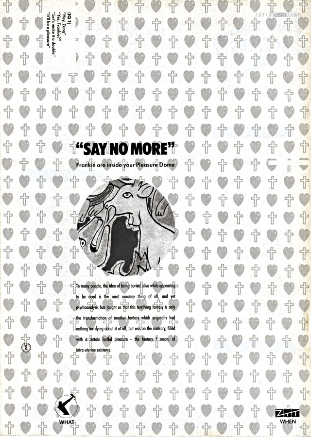 artist: Frankie Goes To Hollywood title:Welcome To The Pleasuredome format: 1 pg Jamming advert design:XLZTTillustration: Lo Colecat. no: ZTT IQ 1 date: 11/84 art of notes: Lo Cole’s image is seen here without censoring fig leaves